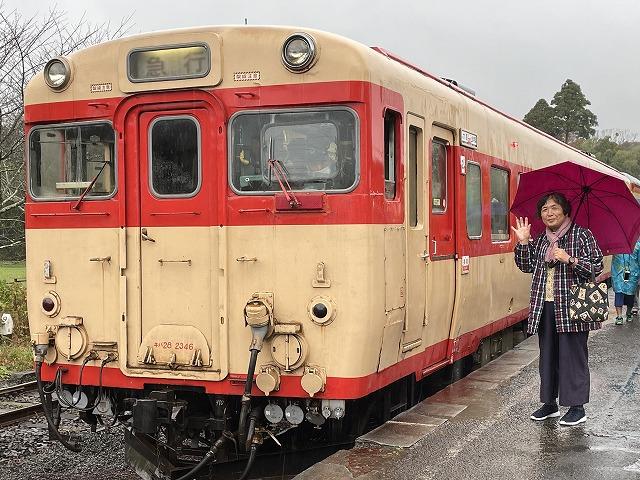 いやあ、一日中雨でした。気温も低くて寒かったです。冬支度でした。私は、雨だったので逆に人込みを避けるために、いすみ鉄道キハの車両の撮影に出かけました。悪天候だからカメラマンの数は少ないだろうと思っていたのです。とんでもない。合羽を着て、望遠のカメラにはビニールをかけてしっかりと雨対策をしてのカメラマンの多いこと。もうびっくりでした。26日と27日で運行は終わりです。お別れは寂しいですね。私は、キハの車両の前で、最後の記念撮影をしたかったのです。雨で濡れてしまって大変でした。思い出に残る1枚になりました。キハ、お疲れ様でした。そして、ありがとう。