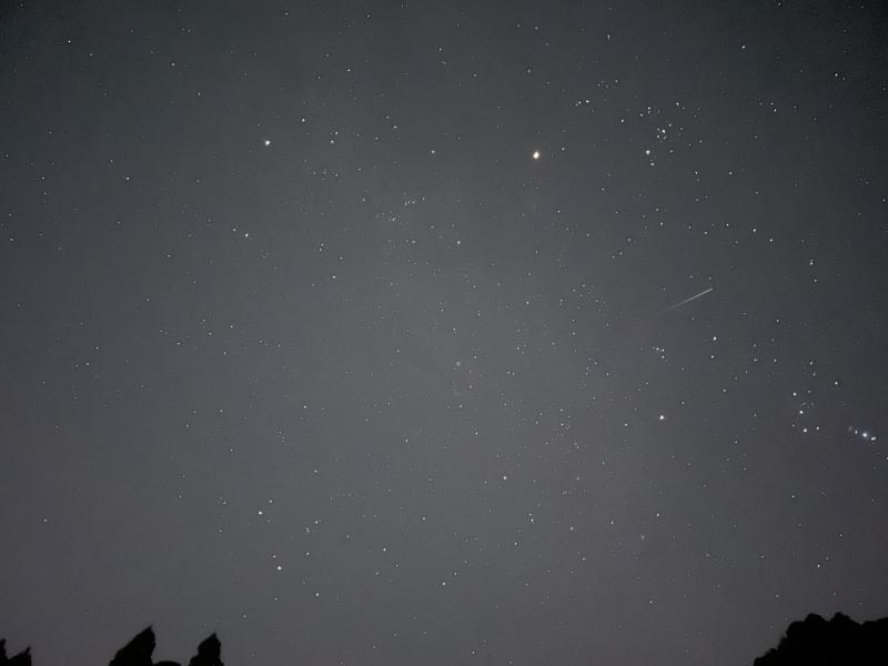 皆さん、こんばんは。昨夜の「ふたご座流星群」を観ることができましたか?。私は、午後7時35分に一番最初に確認しました。東の空から西に流れました。尾が長かったな。9時ごろから30分間、外で観察しました。全部で10個確認できました。放射線状にオリオン座の上の方で流れていました。星っていいね。じっと眺めていても飽きません。見れば見るほど、心までキラキラしてきます。星って不思議です。この写真を見ると、1個だけ流れ星の撮影に成功したのかな?自信がありません。写真もいいけれど、肉眼が一番かな。ねえ、星さん。iPhone12で撮影しました。