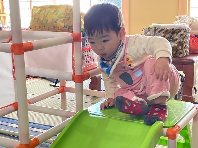 皆さん、お元気でしたか?。午後になって青空が見られなくなりました。だから、寒くなりましたね。午前中、用事があって久しぶりに、〇〇ちゃんの家に行きました。ずっと写真の掲載ができなかったので、とっても嬉しかったです。ちょっと会わないうちに、顔がとってもしまっていました。赤ちゃんではないですね。おじいちゃんが買ってくれた大きな大きな滑り台が大好きなのですね。自分で階段も登れます。滑り台で滑ったり消防車を滑らせたり、自分で工夫をして遊んでいました。「いや、いや。」もはっきりと聞き取れました。自分の思い通りにならないと、泣いて抵抗します。そのしぐさが可愛くて可愛くて。思わず、私も笑顔になりました。帰りは、おじいちゃんが押す、ベビーカーに乗って、私に「バイバイ。」をしてくれました。これでは、毎週来たくなりますね。(許可をいただいて掲載)