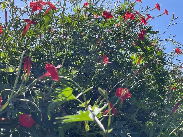 今日から10月です。やっぱり秋風になりましたね。私は、朝から、「ナバナ」の移植をしました。しばらく水かけをしなければいけません。近くの友達の家に行きました。空にむかって伸びる小さな花を見つけました。昔からよく見かける花です。「縷紅草(るこうそう)」と言います。この花は、初夏から晩秋まで星形の小さな小花を無数に咲かせるつる性の一年草です。寒さに弱いために一年草として扱われています。細い糸という意味のある縷に花色の紅が合わさって「細い糸のような葉を持ち、紅色の花をつける植物」という意味から名前が付けられています。花言葉は、「繊細な愛」「元気」です。私も、毎日元気でいよう。この花のように。