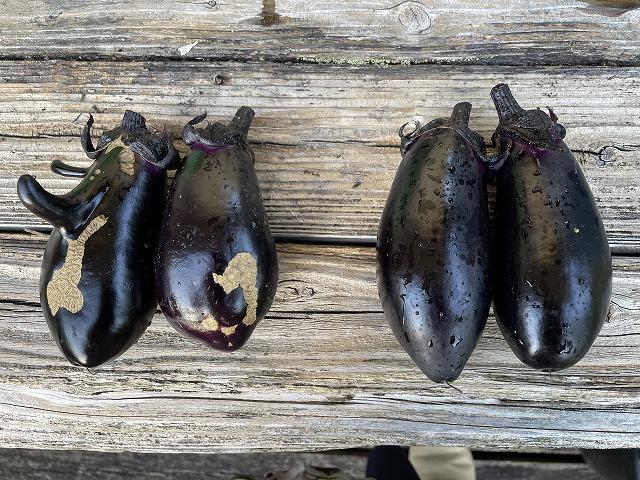 このナスは、私が育てている、無農薬・有機栽培のナスです。クイズですよ。左右のナスは同じですか?。正解は、違いますね。どこが違うのでしょうか?。考えてみてくださいね。左のナスは茶色の部分が見えますね。右のナスは、紫色をしていて無傷だと思います。無農薬ですからどうしても虫が寄ってきます。1日3回の虫退治をしています。毎回、10匹は捕まえています。無農薬の限界を最近、感じています。でも、今年の目標が、無農薬・有機栽培を決めたので頑張ります。1年終わって、今後どのようにするか考えたいと思います。オーガニックは魅力的ですが、栽培面積が広いと殺虫剤が使えないので厳しいですかね。悩む毎日です。