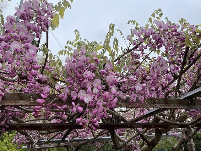 全国の皆さん、お元気でいらっしゃいますか?。もうすぐ大型連休が始まりますね。計画は立てましたか?。私は宿泊客の皆さんのお出迎えで終わりそうです。天気が心配です。春だったり初夏だったり。体がなかなかついていきませんが、季節の花だけは、しっかりと人々の心を和ませてくれています。今、「フジ」の花が満開ですね。ヤマフジも垂れ下がって見事です。近所にこの写真の「フジ」の花が咲いています。ピンク色です。白と紫色はみるのですが、珍しいでしょ。ピンクは・・・。棚が出来ていて、きちんと管理されています。
