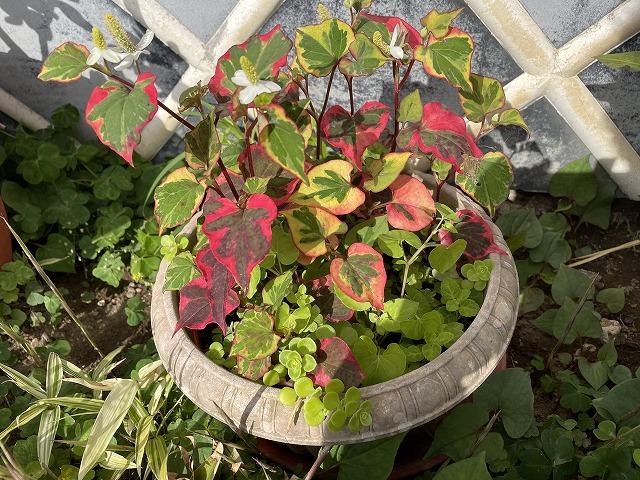 皆さん、この写真は、敷地や畑でよく見かける草です。根がしっかりしていて厄介な雑草なのです。しかし葉が赤いでしょう。珍しいですね。「ドクダミ」です。品種改良してあるのですね。見応えがありますよ。雑草ではなく観賞用になっていますね。