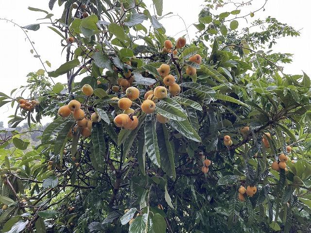 この雨の中でも少しずつ色づき始めたビワ。ほら、たくさん実っていますね。このビワを食べたいと思うのは、人間だけではありません。山から「ハクビシン」や「アライグマ」が下りてきて食べてしまうのです。下に、種だけ落ちていますからね。どちらが先に試食できるかな。人間も動物も食べなければ、生きられないからね。「いいよ。お福分けをするからね。」