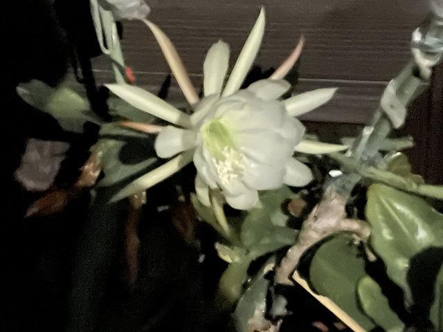 いよいよこの写真の花が咲き始めました。花の名前は、「月下美人」です。メキシコの熱帯雨林地帯を原産地としています。夕方から咲き始め、朝にはしぼんでしまいます。花には強い香りがあります。さて、花言葉は?「ただ一度だけ会いたい」です。会いたい想いを伝えるのにぴったりですね。iPhone12でナイトモードにして撮影しています。夜の撮影もいいですね。