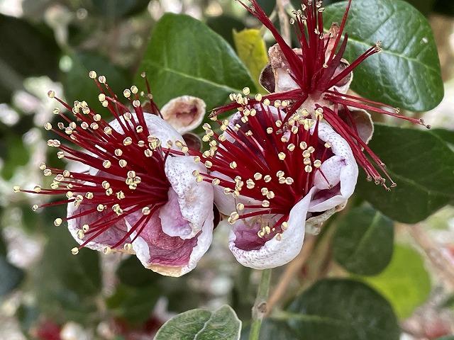 全国の皆さん、こんばんは。今日、知り合いの家に行きました。なんと、この写真の花が咲いていたのです。私は、この花の実が大好きです。もちろん花も好きですよ。花の名前は「フェイジョア」と言います。ニュージーランドで栽培されていて、別名パイナップルグアバと言います。5月頃に花が咲きます。秋に香り豊かな甘い実がなります。花も食べられますよ。花火のような花に新鮮さと魅力を感じませんか。花言葉は、「実りある人生」「情熱に燃える心」です。私もこの花のような人生を送りたいです。