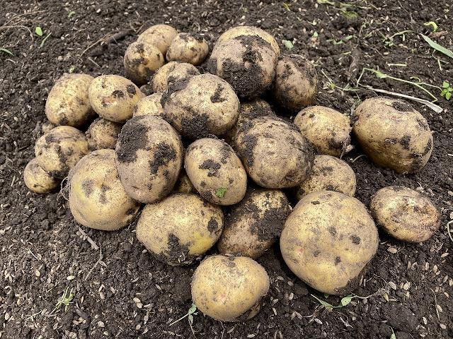 午後、天気が崩れそうなので、ジャガイモ掘りを午前中で終わらせることにしました。全部で5列植えました。ジャガイモは、土が濡れていることを嫌います。春、種芋を植えても腐ってしまうこともあります。もちろん芽が出ませんね。我が家の畑は、ジャガイモ栽培には、あまり適していません。でも、今年はちょっと違います。大きいジャガイモがたくさん実っていました。品種は、「きたあかり」です。肉じゃがを作ろうかな。そうだ。東京に住んでいる孫たちのところに送ることにします。