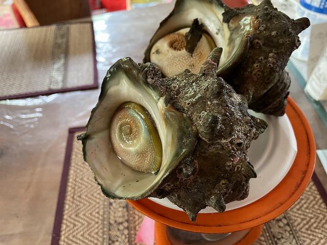 皆さん、「サザエカレー」というメニューがあるのを知っていますか?私が住んでいる市や近隣の町では肉の代わりに、サザエを使います。サザエからのだしが美味しくてたまりません。私は、今夜の一品が、茹でたサザエをスライスして。ワサビで頂きました。美味しかったよ。このサザエがあまりにも大きかったので、計ってみました。なんとなんと2個で約1キロありました。と言うことは、1個の値段は1000円以上になりますね。中身より殻の重さの方がありますね。ちなみに、私は、サザエの味噌漬けが大好きです。宿泊客の皆さんは、サザエの炊き込みご飯のリクエストが多いです。