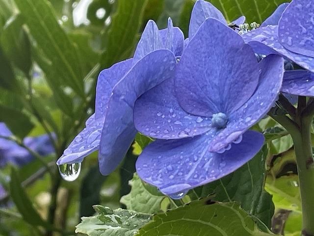 私は、雨とカタツムリとアジサイは、セットで考えていいかなと思っています。そこで、アジサイの葉っぱにカタツムりがいないか探しましたが、全くいませんでした。どこに行ったのかな。カタツムリさん、出ておいでよ。カタツムリには出会いませんでしたが、花びらに雨のしずくが膨らんでいました。このままでいるのかな。それとも下に落ちてしまうのかな。何でもないことなのですが、角度を変えて観察すると、楽しい発見につながります。写真っていいな。