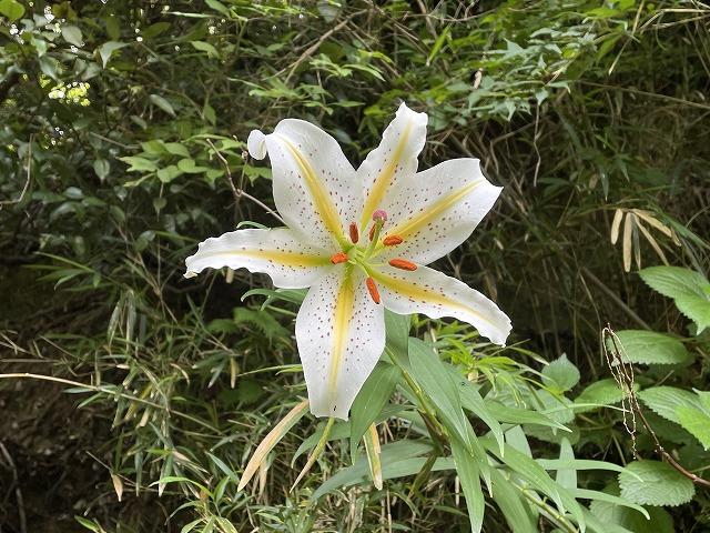 全国の皆さん、こんばんは。今日は、雨を覚悟していたのですが、全く降りませんでした。むしろ、青空が広がっていましたね。朝からサツマイモ畑の草取りの汗で、びしょびしょになってしまいました。着替えましたよ。10時に家の中に入り、水分を補給してから散歩に出かけました。「一輪だけど、見事に咲きましたね。」土手ですが力強く突き出ていました。この花は、ヤマユリですね。私が子どものころ、亡き父が山に入り、百合の根を掘ってきてくれました。それを焼いて食べた、あのほくほく感は、忘れられません。最近、昔のことを懐かしく思う私です。歳を感じますね。心では、若いと思っているのですが・・・。