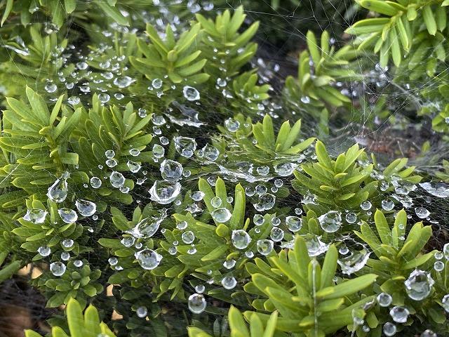 隣の垣根を見たら蜘蛛の巣が何か所が見れました。そこに朝露の水滴が絡まっていました。それはそれは、キラキラでしたよ。大小様々な水滴は、芸術的でもありました。一見見逃しそうですが、よく見れば、自然界の発見でしたね。