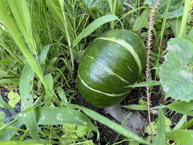 全国の皆さん、今日の蒸し暑さは、辛かったですね。外仕事で頑張っていた方たちは大丈夫でしたか?これからも、気を付けてくださいね。早朝5時からの畑仕事は、汗だくでした。目に汗が入りしみて痛くなるのです。シャワーを何回使って何回着換えをしたか分かりません。午後は、ぐったりでした。そんな中、元気もりもりは、カボチャとスイカです。ほら、カボチャがたくさんなっているのです。もうすぐ食べられそうですね。完全無農薬のカボチャです。
