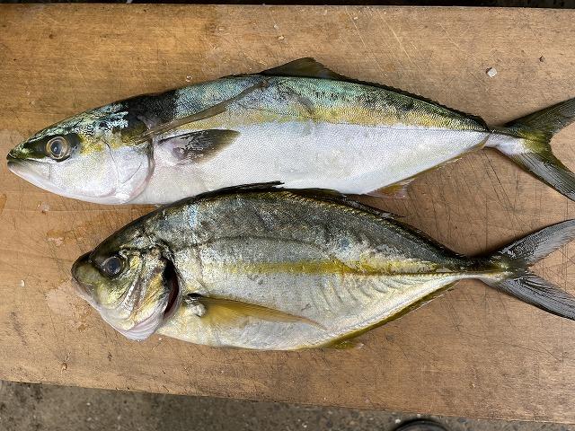 今日水揚げされた写真の魚。皆さんは、この魚の名前をご存知ですか?。特に、下の小さめの魚は、高級魚です。魚屋さんでも、なかなかお目にかかれません。大きいのが「イナダ」、小さいのが高級魚「シマアジ」です。スーパーでは、すぐ食べられるように、切り身になっていますので、魚の名前を覚えられなくなっています。シマアジは「なめろう」にして食べたら幸せな世界になります。とにかく美味しいです。皮をはいで3枚におろしてから、叩いて身を細かくして、しょうがと大葉と味噌で和えて食べるのです。こんなに美味しいものはありません。ご馳走様。ありがとう。たまには、魚屋さんの訪問もいいですよ。