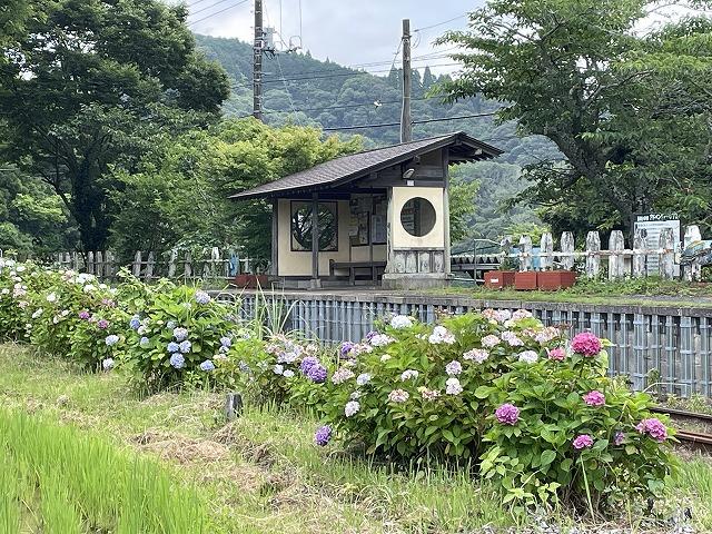 この写真は大多喜町のいすみ鉄道「城見が丘駅」です。これから、列車が入ってくるところです。ここも無人駅です。利用する人たちが、2~3人ぐらいいました。アジサイの花が出迎えてくれましたよ。乗客の皆さん良かったね。
