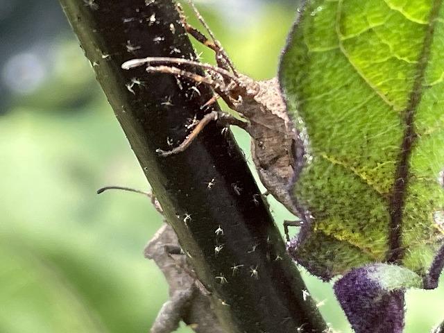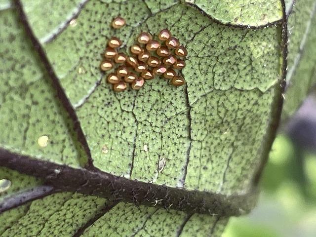 私は、早朝5時から、畑の草取りをしました。7時ごろからは、夏野菜の人工授粉や見回りをします。今、野菜は、無農薬・有機栽培をしているからです。ナスのところに行きました。「えっ、ナスの葉に穴が開いている。どうしてなの?。」葉を1枚ずつひっくり返し裏まで確認しました。「葉の裏についている、小さな粒は何なの。あっ、害虫の卵だな。」と言うことに気づいたのです。それから20本のナスの苗を調べたら、害虫はいるし卵はついているしショックでした。朝だけの見回りでは無理なことが分かったので、今日から朝・昼・晩の3回調べることにしました。あーあ、疲れたな。無農薬栽培の限界を感じましたが、引き下がるわけにはいかないので、とにかく手で退治をしていきます。