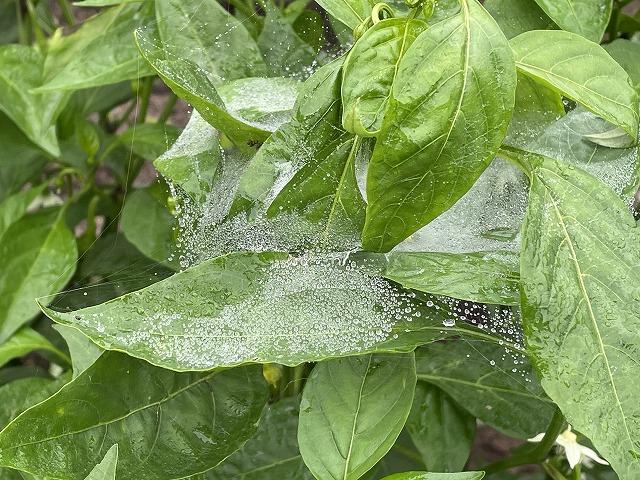 全国の皆さん、こんにちは。30度越えのムシムシ感、ちょっと動いただけで汗びっしょりです。私の毎朝の仕事である害虫退治。万願寺トウガラシには、カメムシがますが、今朝は見つかりませんでした。やったあ。その代わりに、茎の上に蜘蛛の巣が出来ていました。ちょっと珍しかったので、はい、カメラでした。
