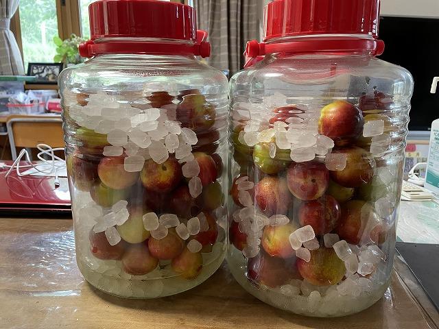 私は、知り合いからプラムをたくさんいただきました。どう加工するかネットで調べてみました。梅やしそのジュースは毎年作るので「プラムジュース」を初めて作ることにしました。材料は、プラム3kg・氷砂糖1、5kg・酢230ccです。プラムはへたを取って洗って水をきります。一つ一つふき取ってから瓶に入れますが、氷砂糖-プラム-氷砂糖-プラム-氷砂糖の順に詰め込んで、最後に酢を入れます。明日からは、毎日ビンを転がして酢を全体に回します。1カ月やったら中からプラムを取り出して、今度はジャムに加工するのです。出来ました。1カ月後が楽しみです。奇麗なジュースになりそうです。