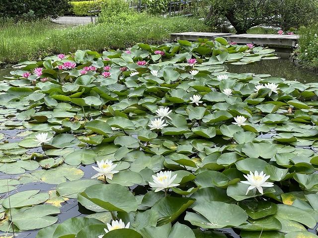 私の家の前には昔、田んぼだったところで、水を張ってある休耕田があります。ずっと前、夫が「スイレン」を植えたのです。今では、増えて増えて、赤と白のスイレンが、こんなに咲いています。中には、「ハスですか?」と聞いてくる人もいます。数年前までは白が少なかったのですが、今では、バランスが良くなりました。道路を通る人たちが観て和んでくれればいいなと思っています。