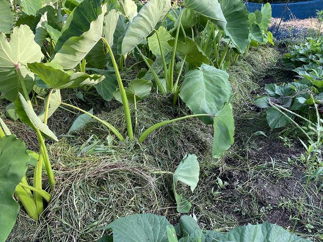 早朝から畑の仕事が始まります。今日は里芋に追肥をやり土寄せをします。サトイモに日が入ると育たないと言います。サトイモは水をしっかりとかけます。水分が蒸発しないように枯れ草をかけるのです。オーガニックの野菜作りは、途中の管理と虫退治で時間がかかってきます。さぼっていると美味しい野菜はできません。子育てと似ていますね。