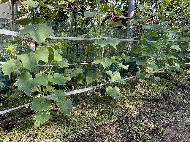 今年は、雨の日が少ないので、畑の野菜の管理が難しくなってきました。特に、キュウリと里芋です。水を沢山かけないといけない野菜だからです。サトイモは、下の葉が黄色くなってきました。水が足りないのです。そこで、根元を枯れ草でくるんで保湿性を保ったのです。キュウリは水が不足すると曲がってしまいます。真っ直ぐなキュウリにするために、水かけで頑張ります。