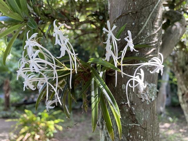 近くの知り合いの人から、「風蘭が咲いて、いい香りがするよ。」という連絡をいただいたので、訪問してきました。我が家にも、亡き祖父が管理していたのでありますが、あまりじっと観察したことはありません。木のくぼみに苔やミズゴケをつけて、そこにランの花をくつけると、ついて花を咲かせます。木の幹から違う花を咲かせるので風情があるでしょう。それだけではありません。顔を近づけると、「蘭の香りがしますよ。」これが何とも言えません。暑いけど日陰でちょっと素敵なひと時でした。連絡をくれてありがとう。