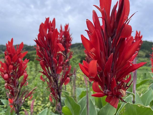 今、真っ盛りのカンナの花。色の数も多くなりました。近くで、赤いカンナの花が咲いていました。雨の少ない今年は草花にとっては、水分不足で大変です。でも、真っ赤でこんなに奇麗な花を咲かせ、観る人たちを和ませてくれます。花を観て怒る人はいません。ホッとしますね。カンナさん。