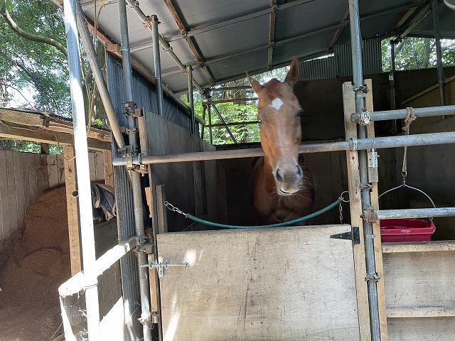 私は、今日御宿町に行った帰りに、競走馬ハルウララが余生を送っている、マーサ牧場に寄ってきました。ウーちゃんは、外には出ていませんでした。理由は熱中症になることもあるからです。症状は人間と似ていてふらふらになるそうです。木陰の屋根付きの柵の中にいました。大型扇風機がずっと回っています。馬は立って寝るのです。立てなくなったら命にかかわるのだそうです。この暑さです。人間も馬も自然も、この暑さには、参っています。馬は前足で、地面をかじる動作をします。クイズですよ。その理由は?「餌を頂戴、」と言う動作だそうです。「ごめんね。今日は餌がなかったね。この次ね。」と言いました。じっと私の顔を見つめていました。正直だね。ウーちゃん。この次は、ご馳走するね。