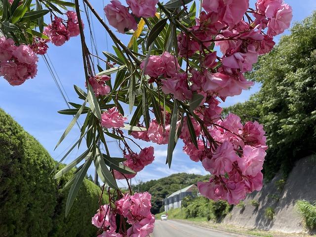 7月になり、車の中からこの花を見かけるようになりました。街路樹や公園、高速道路等の緑化に植えられることが多いのです。葉の裏に小さくくぼんでいるところがあり、内側には毛が生えてフィルターの役割をしています。外からくる排気ガスなどの有害物質を妨げる形になっています。だから、公害に強いのですが、花・枝・根などすべてに、有毒物質が含まれているので、注意してくださいね。この花は、「キョウチクトウ」と言います。