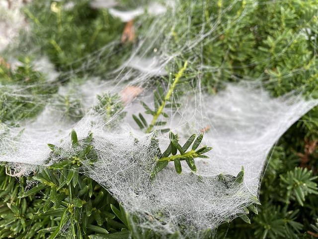 この写真は、早朝の垣根にできた蜘蛛の糸です。何気ないかもしれませんが、面白いのでシャッターを切りました。よく見ると、小さい蜘蛛がいますね。たくさんの糸をあちこちに張るのも行ったり来たりしなければいけないので、大変だね。よく頑張って働いていますね。この蜘蛛の糸は、お昼には消えてしまいます。