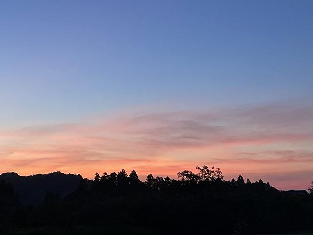 この写真は、昨日の夕焼けです。オレンジ色に染まった空を見て、小声で「夕焼け小焼けの赤とんぼ・・・」と歌ってしまいました。山の頂一面が、オレンジ色に染まっていたからです。赤とんぼではなく、違うトンボはたくさん飛んでいましたよ。里山の良さはありのままの自然かな。時がゆったりと流れていきますね。