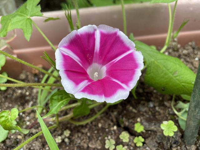 全国の皆さんお元気ですか?九州では災害が発生しています。関東では、酷暑で大変です。体調には気を付けて、前を向いて協力しながら生活しましょうね。私が種を蒔いた、1日中咲いているピンクのアサガオが咲き始めました。下の方の葉をキョンに食べられたのですが復活しました。キョンは、毒性のあるものだけは食べません。よく知っていますね。頑張って、たくさんの花を咲かせてね。