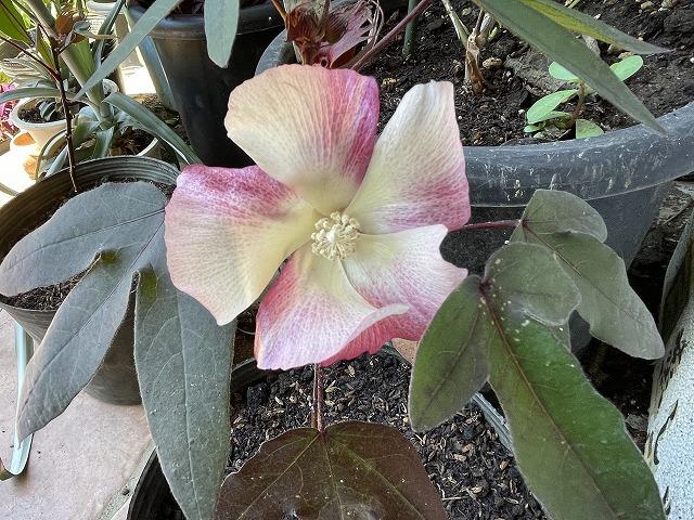 皆さんは、この花を観たことがありますか?。私は初めてです。この苗は、知り合いからいただいて植えたのです。背丈はまだ小さいのですが、もう花は咲くのです。色も薄くて控え目でじっと見ていたくなります。この花は、「綿の花」です。白いふかふかの綿です。これからが楽しみです。元気に育ってね。