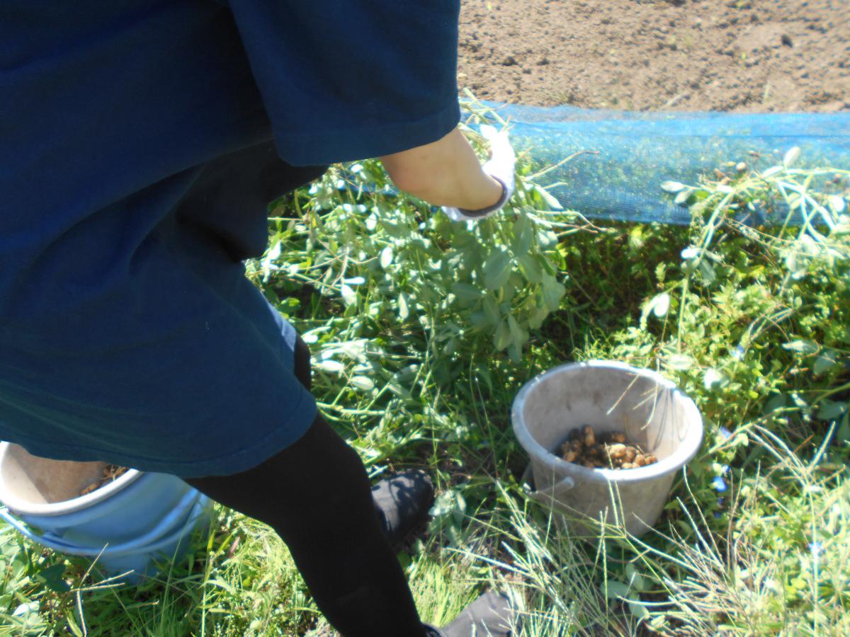 皆さん、心地よい秋風が吹いている一日となりました。さて、ここ数日間、我が宿では、農泊のお客さんの受け入れをしていました。ちょうど、落花生の「おおまさり」という品種の収穫をしました。「おおまさり」は、塩ゆでにして食べると大変に美味しいのです。粒は、とても大きいです。スコップを持って出発。まず、私が掘ってお手本を見せます。次から、宿泊客の出番です。「えっ、お母さん、落花生ってこうやってできているの?」この体験をやってもらうと、ほとんどの人たちが同じことを言います。まず、地中にできていることに感動します。すっと伸びたひものような先にさやがついているのです。そこで、私の出番になります。「落花生って、どんな漢字を書きますか?」「落ちる花でしょう。」「その通り、花が落ちるようにして地中で実を生むことから、落花生という名前が付けられたのよ。」とさりげなく教えるのです。みんな目を丸くしています。まるで、畑が教室のようですよ。バケツの中に収穫した落花生が入っています。