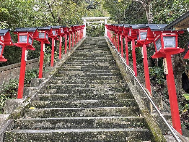 全国の皆さん、こんばんは。私は、数日前に、勝浦市の「遠見岬(とみさき)神社」に行ってきました。頂上まで上がったのは、本当に数年ぶりでした。赤い灯篭が階段の両側に設置されたのですね。皆さんの中に見たことがありそうな人がいらっしゃるのではないでしょうか。「ビッグひな祭り」の会場でもあります。この石段に、全国から集められたひな人形を飾る場所です。見応えがありますよ。この写真は下から見上げて撮影をしました。お人形がないのが残念です。