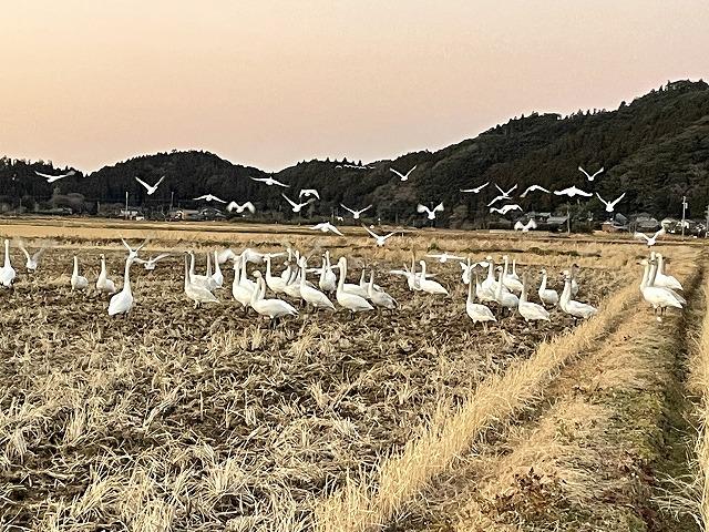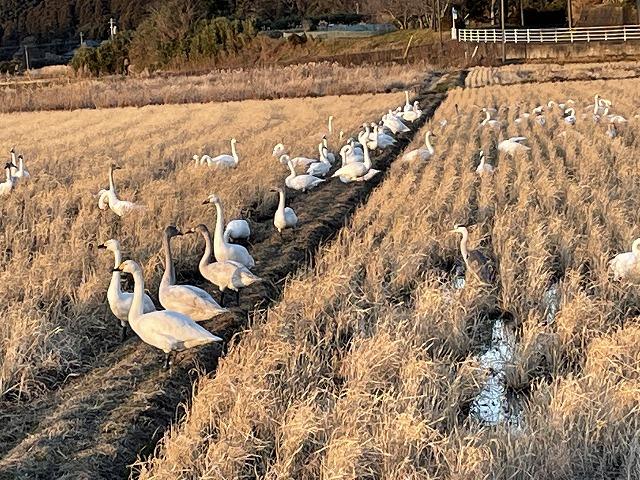 コハクチョウの数が、とっても増えています。見応えがありますよ。毎日、下りる田んぼが違うのです。どうしてなのかな?夕方、散歩をしていたら、ちょうどねぐらに帰るために飛び立つところでした。バタバタバタという羽の音。たくさん飛び立つ瞬間は、圧巻です。羽音がいいですね。やっぱり現地で観るのが一番だと思います。皆さん、待っていますよ。私が住む、いすみ市布施地区です。