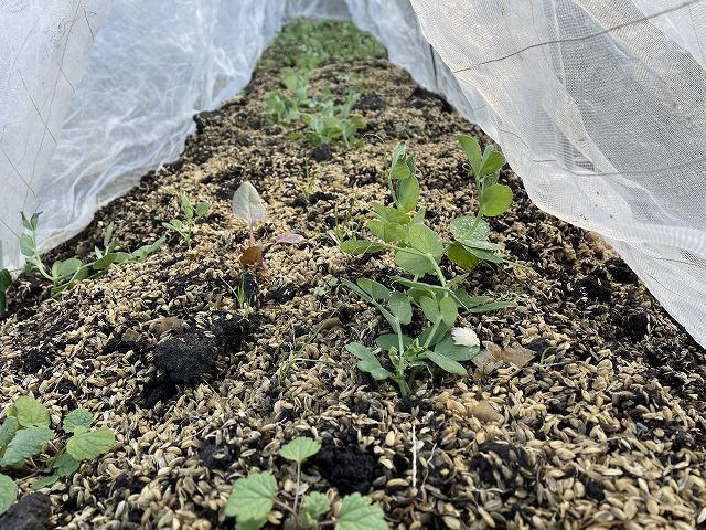 秋に種まきをした「スナックエンドウ」が、毎日毎日霜が下りているのに頑張って根を張っています。今、一番怖いのは、小鳥に食べられてしまうことです。ヒヨドリが来ています。そこで、ネットをかけてあります。畑は、イノシシ・キョン・鳥の対策をしなければいけません。本来の仕事ではない仕事に時間が費やされます。寒いのでさすがに虫はいませんが、春先は虫退治です。いつになっても、畑の管理は、表向きでは分からない仕事が多すぎますね。無農薬・有機の野菜作り、想像を超える大変さがあります。