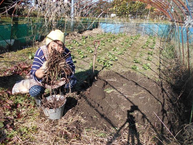 皆さん、お元気ですか?。今日は1月10日ですね。毎日毎日があっという間に過ぎていきます。私は、強風の中、畑の土の天地替えをしました。スコップで掘り返し、根を取り除き、固まっている土をほぐすのです。土の中では、ものすごい根があっちこっちに、はびこっています。土手や垣根で見かけるオレンジ色の小さい花をつける、「ヤブガラシ」と言います。毎日3時間の作業でもなかなか終わりません。あと3日はかかります。一昨日、いすみ市への移住を考えいる人たちが、いらっしゃいましたが、オーガニックの野菜を作りたいと、聞こえはとても夢がありますが、実際は簡単には行きませんよ。移住は、良く調べて少し暮らしてみて、覚悟のうえで移住を考えた方がよいと、私は思っています。あーあ腰が痛いです。
