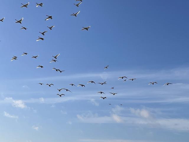 私は今まで、夕方になってコハクチョウが、ねぐらに帰るところを撮影してきました。今日は、朝ねぐらから田んぼに飛んでくるところの撮影をしました。とにかく数えきれない数に、びっくりびっくり。200羽ぐらいいるのではないかと思いました。グループごとに飛んでくるのですが、1グループの数が多すぎる状態でした。カメラマンは、私一人でした。この写真を見てください。午前9時前後です。今までで一番のロケーションでした。