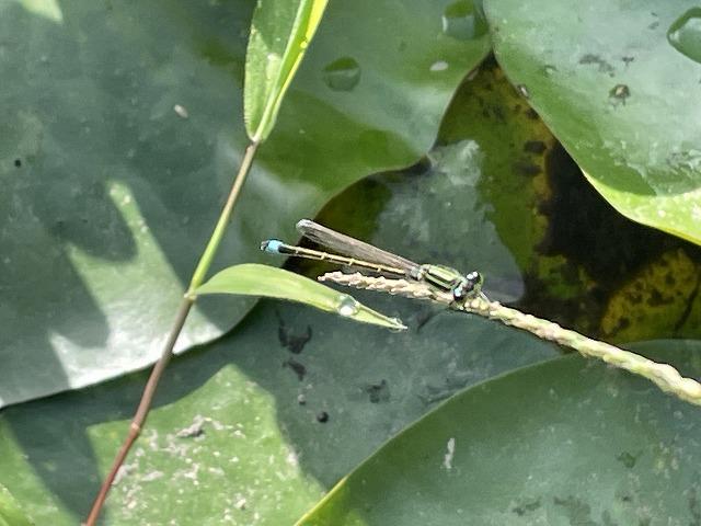 全国の皆さん、毎日毎日暑いですね。水かけも大変です。明日から、少し雨が降るのですかね。我が家には、水を張った休耕田があります。すっと生えている草の先端を見たら、何か止まっていました。いま、トンボがたくさん飛んでいます。その中でも今年初めて見た「イトトンボ」。細くてスマートです。池沼、湿地、水田などに生息しています。幼虫は細長く、尾端に3個の尾さいを持ち、それによって水中でえら呼吸をします。