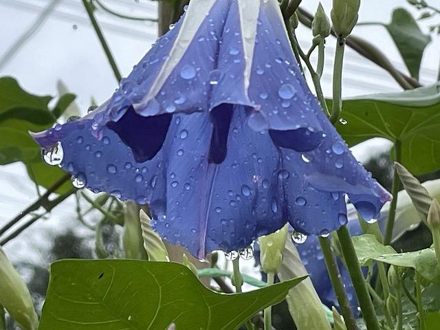 午前中、数回ザアーッと雨が降ってきました。元気に咲いていたアサガオの花も、ぐったりと下を向き始めました。よく見ると花の周りには、しずくが今にも落ちそうになっていました。「アサガオの花と雨のしずく」というコラボも魅力的ですね。でも、アサガオは、やっぱり空に向かって咲いてほしいです。この雨は野菜にとっては、喜んでいると思います。昨日のスーパーで、キュウリが1本、税込みで84円にはびっくりでした。